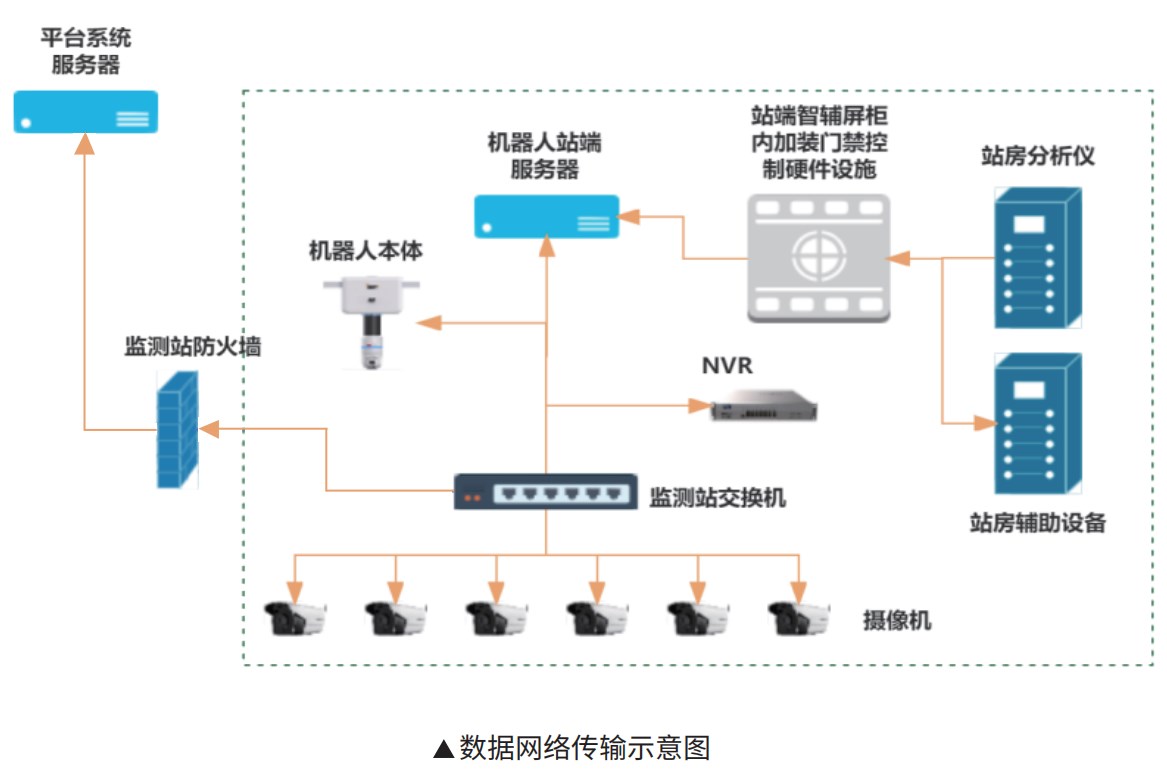 數據傳輸更是系統中的關鍵。運維機器人通過TCP協議接入站端服務器,站房分析儀和輔助設備數據實時上傳,而攝像機視頻數據通過交換機接入NVR,再傳送至站端服務器。站端服務器匯總站房監測數據,經防火墻上傳至上級平臺系統服務器,確保數據傳輸的安全穩定。