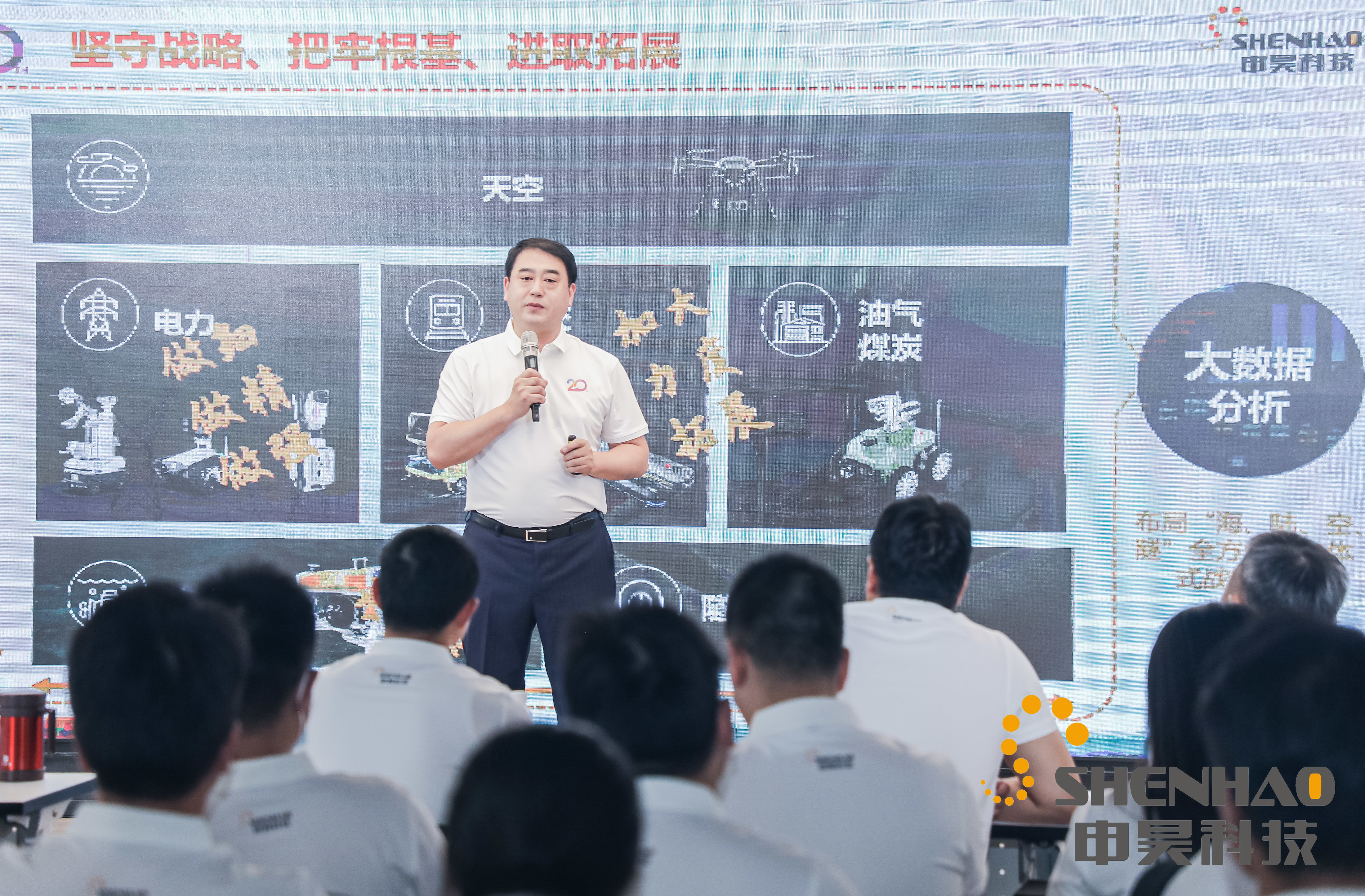 陳如申董事長(zhǎng)發(fā)表致辭,他表示,申昊科技創(chuàng)業(yè)廿載,跟隨國(guó)家的路線,堅(jiān)守國(guó)家發(fā)展戰(zhàn)略規(guī)劃,一步一個(gè)腳印,逐步壯大,從最初的電動(dòng)車檢測(cè),到電力固定端檢測(cè);再到室外、室內(nèi)的電力、石油化工巡檢機(jī)器人;拓展到軌道交通領(lǐng)域的檢測(cè)線路的機(jī)器人、檢測(cè)車底的機(jī)器人、檢測(cè)剛性接觸網(wǎng)的機(jī)器人;發(fā)展至今,產(chǎn)品線正在向著企業(yè)戰(zhàn)略“海陸空隧”各個(gè)領(lǐng)域突破。產(chǎn)品線越來(lái)越豐富的同時(shí),企業(yè)規(guī)模也在不斷發(fā)展壯大。